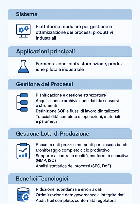 | Gestione dei Processi | – Pianificazione e gestione attrezzature – Acquisizione e archiviazione dati da sensori e strumenti – Definizione SOP e flussi di lavoro digitalizzati – Tracciabilità completa di operazioni, materiali e parametri |